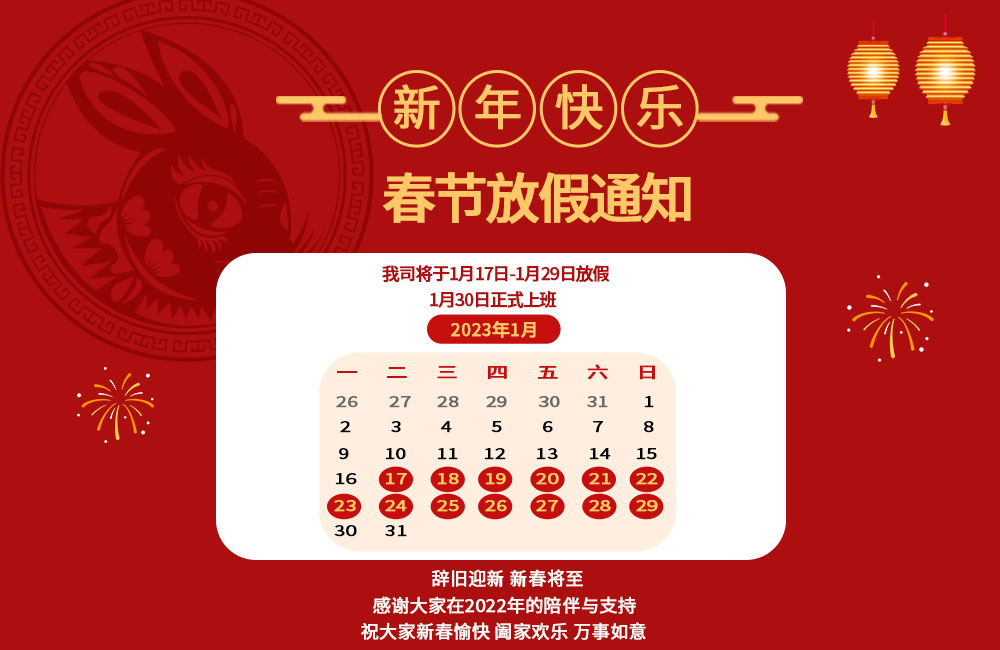 公司于2023年1月17日(農(nóng)歷臘月二十六)—2023年1月29日(正月初八)放假,2023年1月30日(正月初九)開工上班。